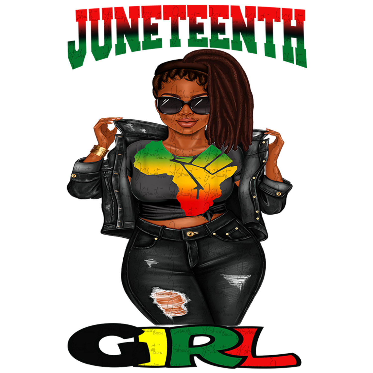 Celebrate freedom and culture in bold style with our vibrant "Juneteenth Girl" tee! Featuring a confident, stylish Black woman rocking sunglasses and a black crop top with powerful Juneteenth symbolism, this shirt honors heritage, history, and pride. Perfect for parades, cookouts, or everyday expression.